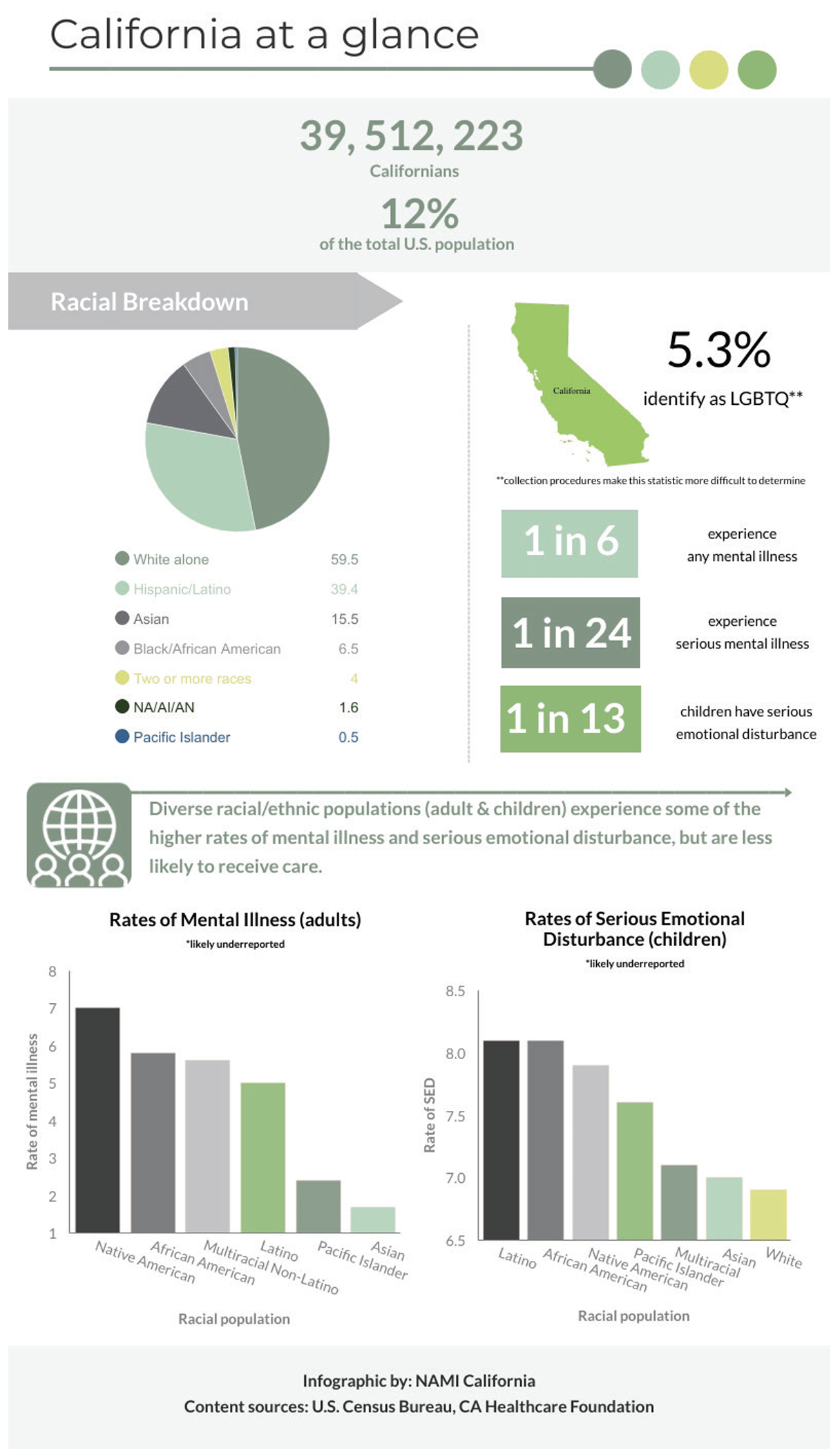In NAMI’s State of the Community report for California, 60% of surveyed individuals in diverse communities, who sought mental health care, reported experiencing discrimination based on their race/ethnicity and/or cultural heritage, and over 40% experienced a lack of cultural awareness and racist language, attitudes, or beliefs. Similarly, while 40% of White individuals agreed that they felt comfortable talking with close family, friends, and community members about their mental health, the rates of those who agreed among minority communities were significantly lower. (7)